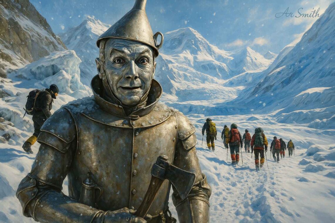 The Death Zone shrieked with winds at 70 mph, ice shards sliced like knives, and amid the chaos came the metallic groan of history—The Tin Man, over 50, logistically overwhelmed, untrained, and hobbling on rusty ankles, taking on Everest with nothing but sheer will and a squeaky hinge. Each gust froze him stiffer, each step echoed like a battered wind…